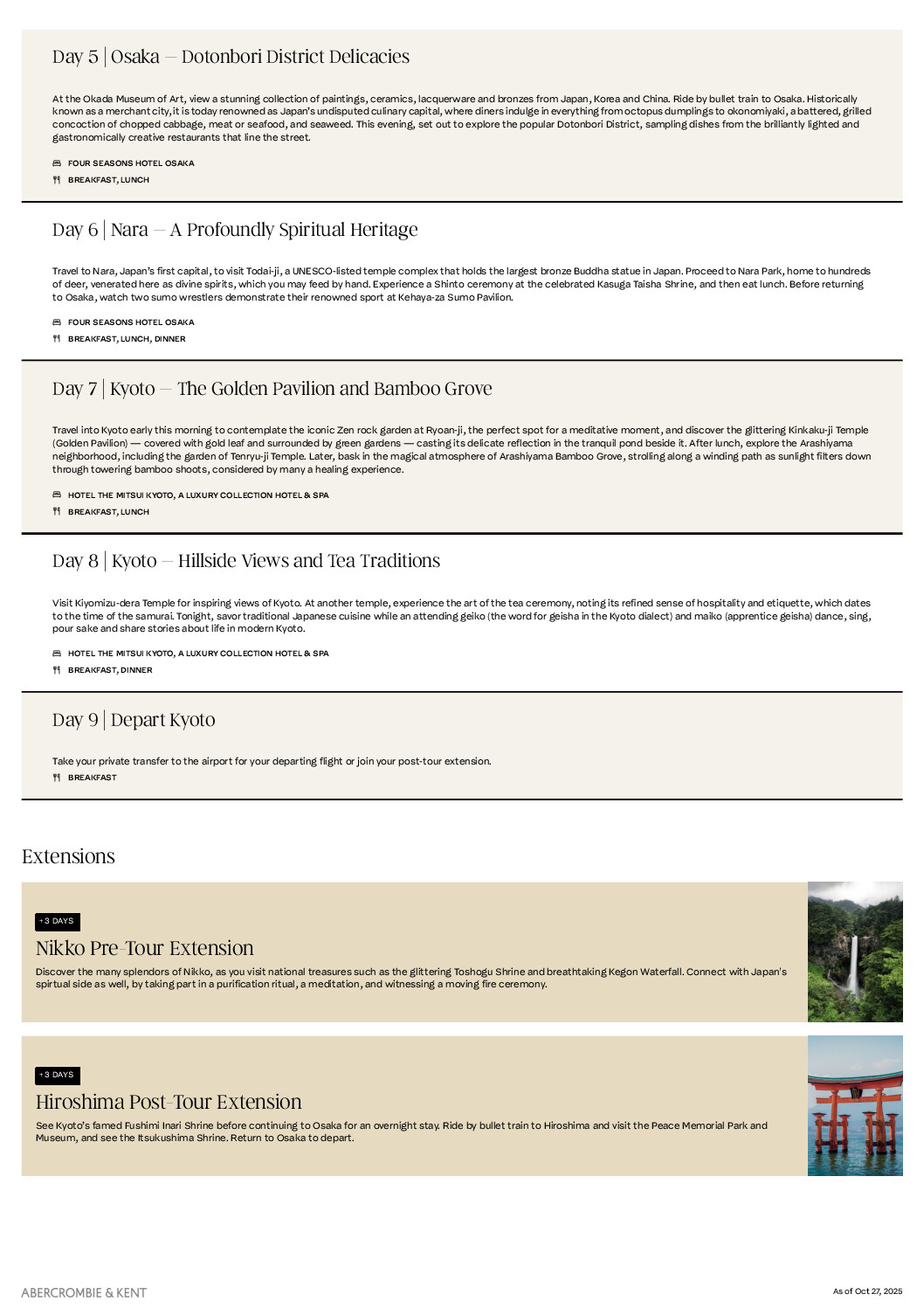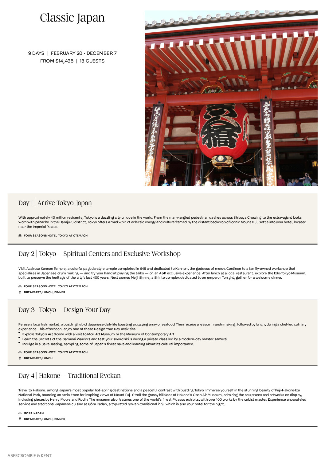 Our favorite travel company for destinations Ujuzi doesn’t reach is Abercrombie & Kent, a pioneer in luxury eco-travel who shares our passion for experiential travel that fosters intimate connections to culture and conservation. To get a taste of what A&K has to offer, view their itinerary for scheduled small group journeys to Japan below.